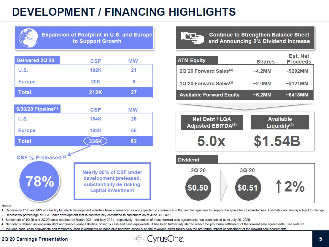 During the quarter, we settled the forward-sale agreement that we entered into in the fourth quarter of 2019 and this resulted in net proceeds of approximately $97 million, which were used to pay down a portion of the amounts outstanding on our unsecured revolving credit facility.” — Diane Morefield, CFO of CyrusOne