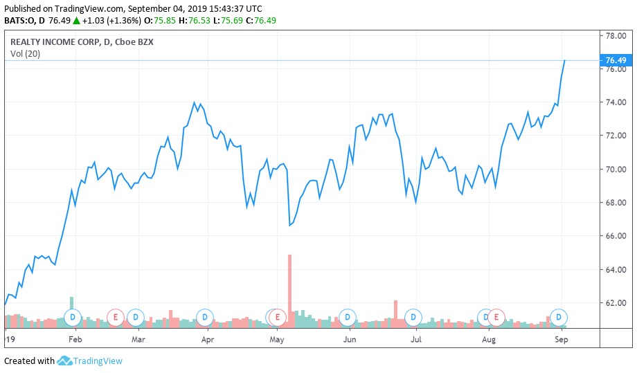Image Shown: Shares of Realty Income Corporation (O) have been on an upward tear this year as excitement over a lower interest rate environment, courtesy of the Federal Reserve, is driving up interest in real estate investment trusts.