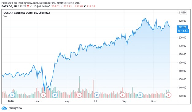 Image Shown: Shares of Dollar General Corporation have surged higher over the past year.