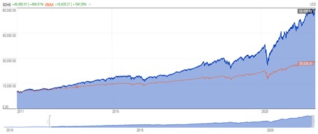 Image: The category of large cap growth (SCHG) has outperformed a 60/40 stock/bond rebalanced portfolio (VBIAX) by ~310 percentage points the past 10 years. Image Source: Morningstar.