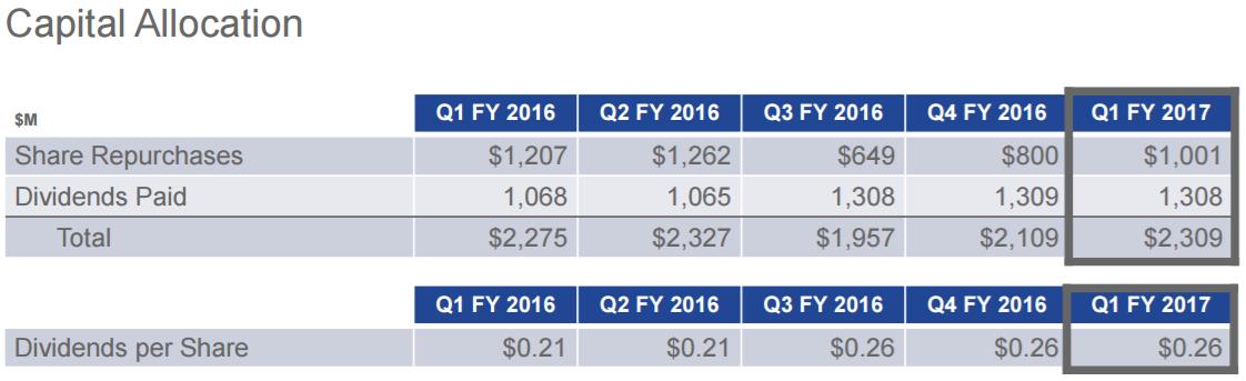 The networking giant’s cash flow from operations remained robust at $2.7 billion during the quarter, and it ended the period with $71 billion in cash and cash equivalents on hand, speaking to its incredible financial strength and dividend-paying power. Cisco’s shares faced selling pressure following the quarterly release, however, as a result of a rather muted outlook for the current quarter. Revenue for the second period of its fiscal 2017 is expected to fall at a 2%-4% annual pace, with non-GAAP earnings per share coming in at $0.55-$0.57, both modestly below consensus forecasts at the time.