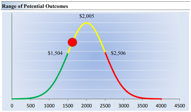 Image shown: The probability distribution of our fair value estimate range for Amazon. The company is trading below our fair value estimate of ~$2,000, but above the low end of the fair value estimate range of ~$1,500. We think shares are fairly valued if they are trading on the yellow line. Amazon’s fair value estimate is very sensitive to its operating margin.