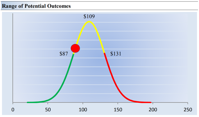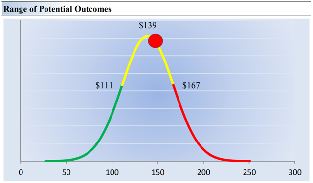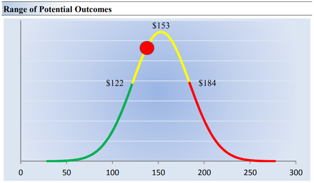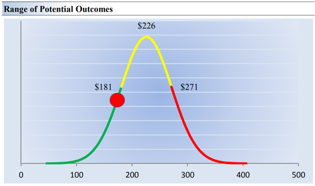 Image shown: The probability distribution of our fair value estimate range for Honeywell. Honeywell is one of our favorite industrials, now that GE has headed south. The company’s aerospace exposure is fantastic, but its shares are pricing in a lot of the good news.