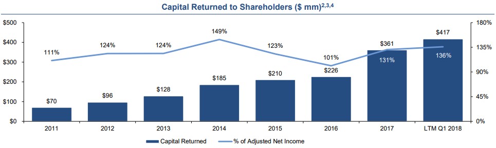 Evercore aims to return all capital to shareholders after growth investments, and this has resulted in it returning more than 100% of net income to shareholders in recent years. The company has more than tripled its dividend since 2008, and its 25% hike in April 2018 (on the heels of an 18% increase in the fourth quarter of 2017) made 2018 its eleventh consecutive year of consecutive dividend increases. Directors and executive officers as a group hold ~10% of total combined voting power of Evercore, suggesting its shareholder friendly ways may be likely to continue.