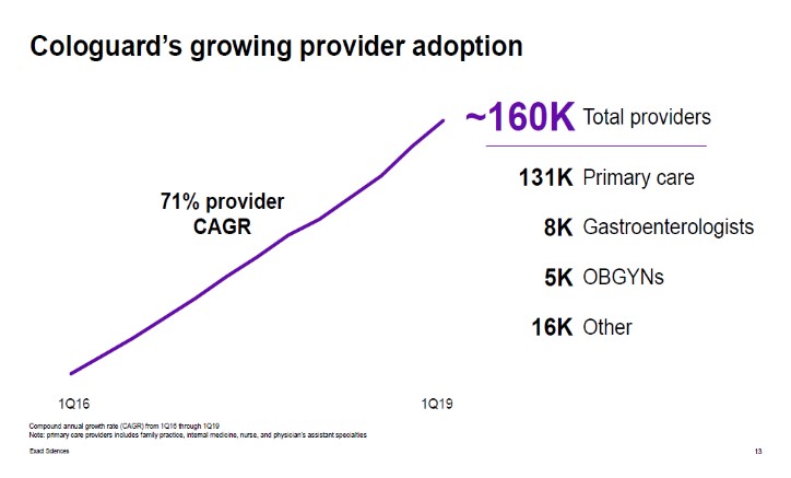 Image Shown: Exact Sciences has seen tremendous growth in the number of healthcare providers prescribing its stool tests, which has been increased usage of Cologuard. Image Source: Exact Sciences – IR Presentation