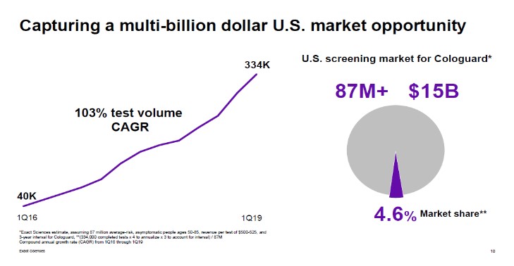 Since 2016, Exact Sciences has aggressively partnered up with healthcare providers to encourage greater usage of its Cologuard tests. Part of this involves encouraging its partners to push patients, particularly those 50 and older, to get colorectal cancer screens for the first time while also encouraging patients to get screened more regularly. For instance, of the 2.2 million patients who have been screened by Cologuard, nearly half of those may have been screening for colorectal cancer for the first time (based on a study conducted by Exact Sciences that surveyed Cologuard users), indicating Exact Sciences strategy is panning out favorably (at least to some degree). Exact Sciences went from performing 40,000 Cologuard tests in the first quarter of 2016 to over 330,000 tests in the first quarter of 2019, and there’s room to keep growing.