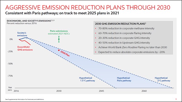 Image Shown: Exxon Mobil is reacting to changing regulatory environments, investor concerns, and societal changes by focusing on reducing its emissions on a per unit basis. Image Source: Exxon Mobil – December 2021 IR Presentation