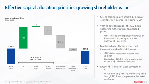 Year-to-date, Exxon Mobil’s GAAP cash flow from operations expanded to $42.8 billion, up from $41.7 billion in the same period of 2023. Non-GAAP free cash flow fell to $26.4 billion year-to-date from $28.1 billion in the year-ago period, but it was well more than total dividends paid on common stock of $12.3 billion for the nine months ended September 30. The company bought back $13.8 billion in stock over the same time period. Exxon Mobil ended the third quarter with $27 billion in cash and cash equivalents, with total debt, notes and loans payable totaling $42.6 billion.