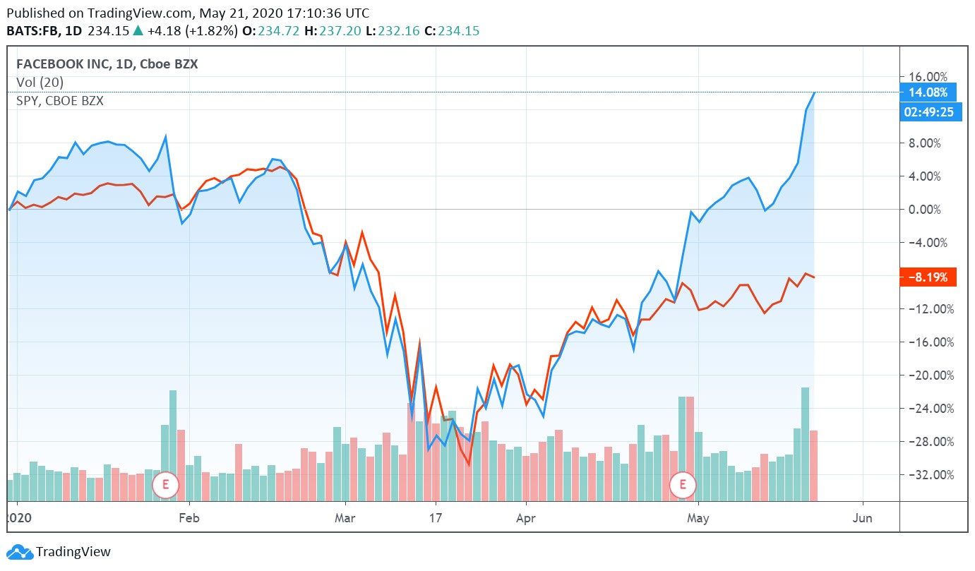 Facebook Inc (FB) is a top-weighted holding in the Best Ideas Newsletter portfolio and shares have surged upwards of late, sparked in part by its strong first-quarter 2020 performance, relatively speaking, given the ongoing coronavirus (‘COVID-19’) pandemic. Members interested in reading our thoughts on Facebook’s latest earnings report are encouraged to check out this article here. As of this writing on May 21, shares of FB are up ~14% year-to-date while the S&P 500 (SPY) is down ~8% during the same period (this is before taking dividend considerations into account; however, that doesn’t change this picture by much).