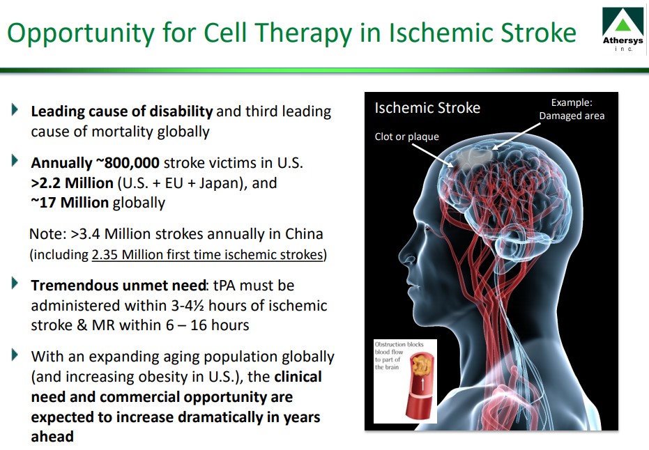 Biotechs are risky, but they can also pay off big if a key drug with tremendous promise is commercialized. From what we can tell, Athersys (ATHX) has a rather intriguing clinical and preclinical pipeline. Among its key therapies is MultiStem for the treatment of ischemic stroke (MASTERS-2 and TREASURE). The therapy can greatly extend the treatment window for stroke patients (from just 3-4.5 hours to almost 3 days). The company has a trial in Japan and is preparing to initiate a Phase 3 clinical trial in North America and Europe under a Special Protocol Assessment. The opportunity in this area is considerable.