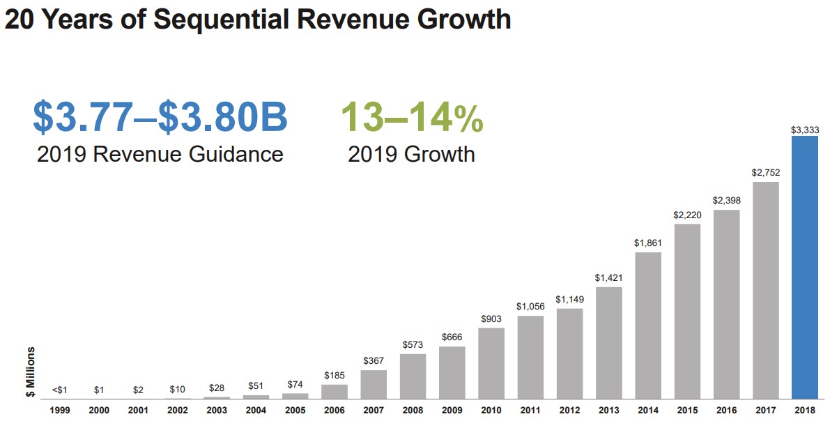 We like Illumina, but its valuation is something that is difficult to get comfortable with. The company held roughly $1.5 billion in net cash on the books at the end of 2018, and while cash flow from operations has been robust at $1.14 billion (2018), $875 million (2017) and $779 million (2016) during the past three fiscal years, it’s hard to get comfortable with its $46 billion market capitalization in such a context. Capital spending wasn’t immaterial during this time period either, averaging approximately $290 million during each of the past three years, still good enough for strong free cash flow generation, however ($846 million in 2018, $565 million in 2017, and $519 million in 2016). For fiscal 2019, the company is targeting revenue growth in the range of 13%-14% and non-GAAP earnings per share in the range of $6.63-$6.73, implying the stock is trading at 45+ times current year earnings on the basis of the high end of the range.