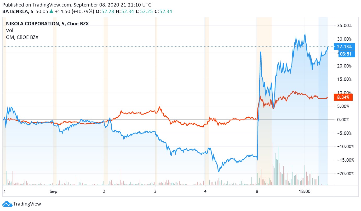 Image Shown: On September 8, shares of General Motors Corporation (in orange) and Nikola Corporation (in blue) jumped higher during normal trading hours after announcing their strategic partnership.