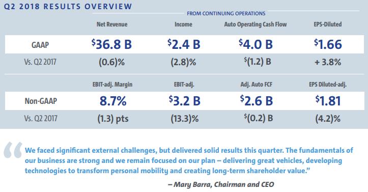 GM’s second-quarter results, released July 25, left a bit to be desired as net revenue fell 0.6%, EBIT-adjusted fell 13.3%, and EBIT-adjusted margin contracted by 130 basis points, all on a year-over-year basis. Nevertheless, the company was able to grow sales and market share in the important US market thanks to ongoing strength in trucks and SUVs, and it reported record second-quarter equity income from China in the period, which was not able to offset weakness in South America as it relates to GM’s international operations. North America EBIT-adjusted margin came in at 9.4% in the quarter, but management noted that its previous 10% target is no longer appropriate given the ongoing commodity price pressures on its bottom line, instead pointing investors to the 9%-10% range as a more appropriate expectation.