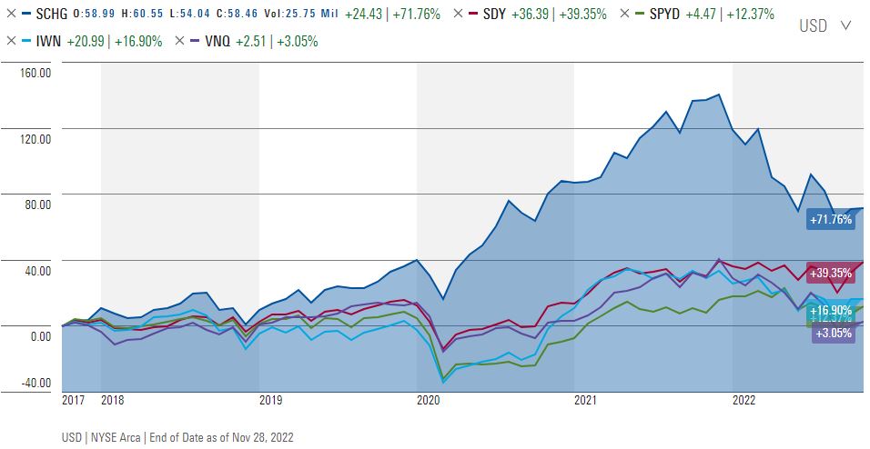 Furthermore, readers could be forgetting that many of the areas that are doing well in 2022 were actually left out of the big market upswing the past few years. During the past five years, for example, an ETF that tracks the area of large cap growth is up more than 70%, while an ETF that tracks the area of dividend growth has advanced ~40%, an ETF that tracks small cap value is up ~17% during the past five years, while an ETF that tracks the area of the highest-yielding S&P 500 companies is up just 12% — according to data from Morningstar. REITs, as measured by the VNQ, are up just 3% over the past five years (image shown below). Even with the pull back in 2022, large cap growth continues to dominate the investing landscape, and we still like this area over the long run.