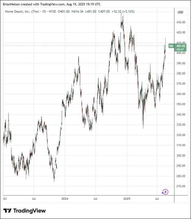 On August 19, Home Depot (HD) reported mixed second-quarter results with revenue coming in-line with expectations and non-GAAP earnings per share missing the consensus forecast slightly. Total sales came in at $45.3 billion, up 4.9% year-over-year, while the company’s comparable sales for the second quarter increased 1% (comparable sales in the U.S. increased 1.4%), up from a decline of 3.3% in last year’s quarter. Adjusted diluted earnings per share for the second quarter of fiscal 2025 were $4.68, up modestly from the same period last year.