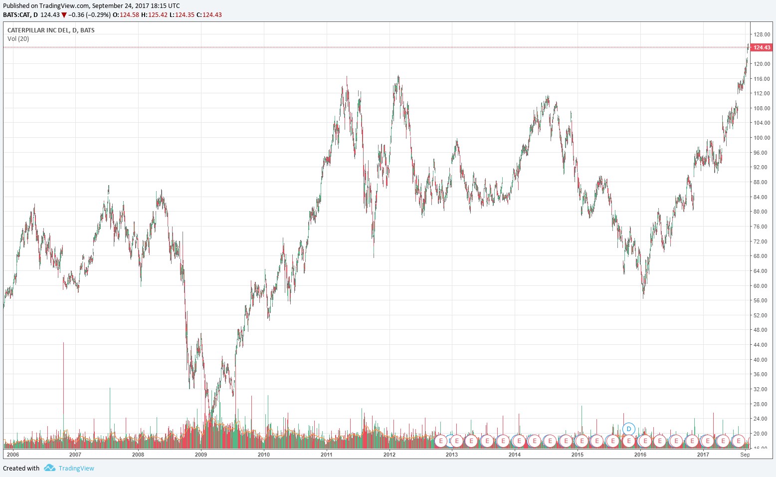 Caterpillar (CAT) is one of our favorite companies from a fundamental perspective, if we look past the cyclicality of its operations and exposure to potential weak credits at its captive finance arm. No matter how you slice it or dice it though, the company’s dealer network is a significant competitive advantage, and the executive team’s ability to manage costs through the course of the economic cycle continues to be impressive. That its shares have now surged past $120+ to all-time highs, levels that it had only come close to reaching during 2011-2012, speak to the resilience of Cat’s equity, especially given the myriad global economic growth concerns during the past decade. But should investors be celebrating the recent rise, or be more cautious because of it?