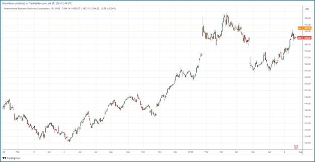 Looking ahead to full-year 2024 expectations, IBM continues to expect constant currency revenue growth in the mid-single-digit range, while it now expects free cash flow to be in excess of $12 billion on the year. IBM ended its second quarter with $56.5 billion in total debt and $13.7 billion in cash and marketable securities. We like IBM’s improvement in free cash flow generation and exposure to AI, but we prefer other ideas in big cap tech, namely Alphabet (GOOG) (GOOGL) and Microsoft (MSFT). Shares yield 3.6%.