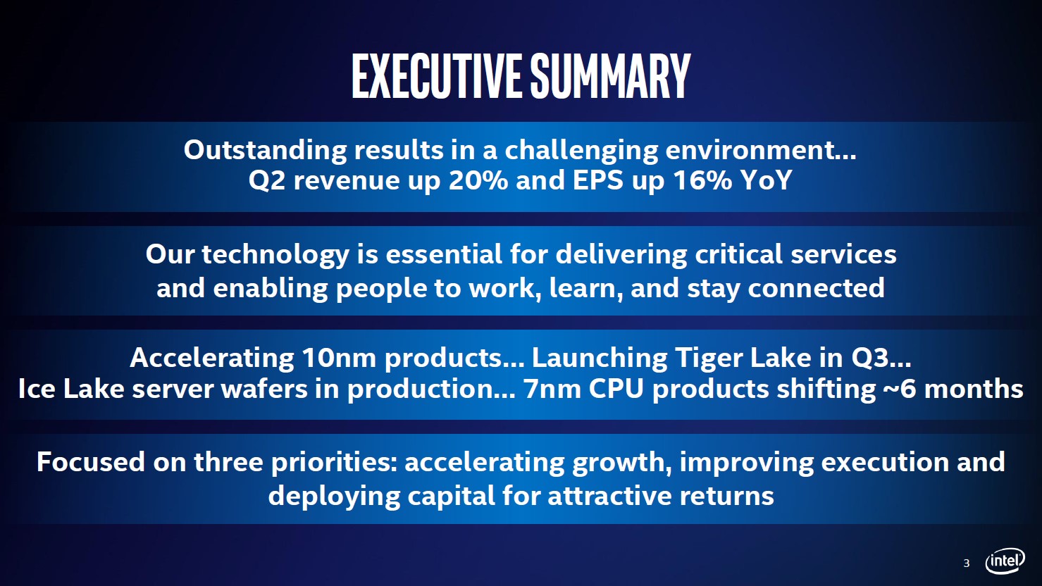 “Intel is accelerating its transition to 10nm products this year with increasing volumes and strong demand for an expanding line up. This includes a growing portfolio of 10nm-based Intel Core processors with “Tiger Lake” launching soon, and the first 10nm-based server CPU “Ice Lake,” which remains planned for the end of this year. In the second half of 2021, Intel expects to deliver a new line of client CPU’s (code-named “Alder Lake”), which will include its first 10nm-based desktop CPU, and a new 10nm-based server CPU (code-named “Sapphire Rapids”).