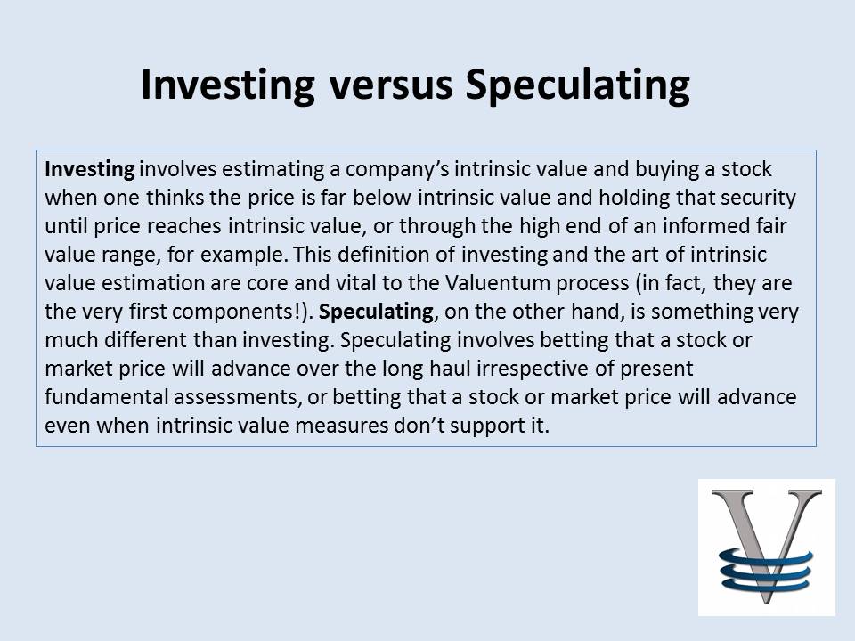 Investing involves estimating a company’s intrinsic value and buying a stock when one thinks the price is far below intrinsic value and holding that security until price reaches intrinsic value, or through the high end of an informed fair value range, for example. This definition of investing and the art of intrinsic value estimation are core and vital to the Valuentum process (in fact, they are the very first components!). Speculating, on the other hand, is something very much different than investing. Speculating involves betting that a stock or market price will advance over the long haul irrespective of present fundamental assessments, or betting that a stock or market price will advance even when intrinsic value measures don’t support it.