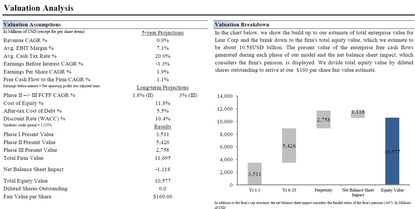 Image Shown: We give Lear a Fair Value Estimate of $160/share with a Fair Value Range of $120/share – $200/share.