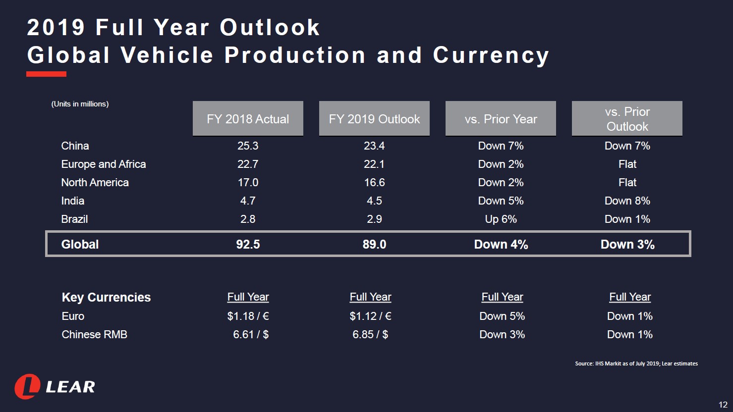 “We continue to face a challenging macroeconomic and industry environment. In the second quarter of 2019, global vehicle production was down more than 7% compared to last year, with China down 17% and Europe down 7%. Lear’s financial results in the second quarter were negatively impacted by continued declines in industry production, a significant number of program changeovers, slower production ramp ups on new vehicles, and continued weakening of global currencies against the U.S. dollar.”