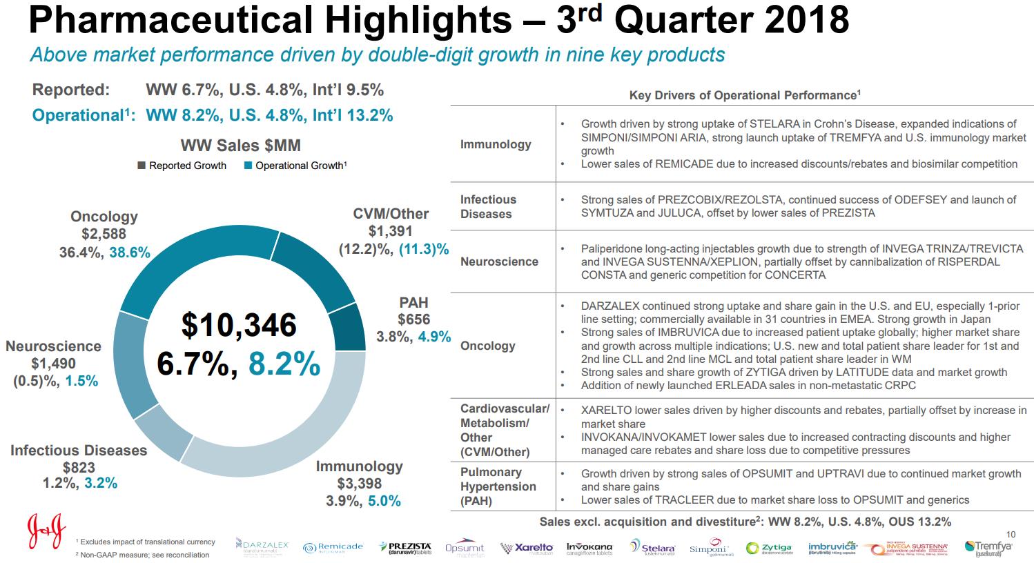 Johnson & Johnson (JNJ) reported 3.6% year-over-year revenue growth in the third quarter of 2018 thanks to ongoing strength in its ‘Pharmaceutical’ segment, which turned in reported revenue growth of 6.7% as reported revenue in its ‘Oncology’ division within the segment leapt 36%+ from the year-ago period. Key sales growth leaders in ‘Oncology’ were DARZALEX, IMBRUVICA, and ZYTIGA, while REMICADE revenue erosion from biosimilar competition was more than offset by strength in other key ‘Immunology’ drugs including STELARA and SIMPONI/SIMPONI ARIA. Overall, nine key pharma products turned in double-digit sales growth in the quarter.