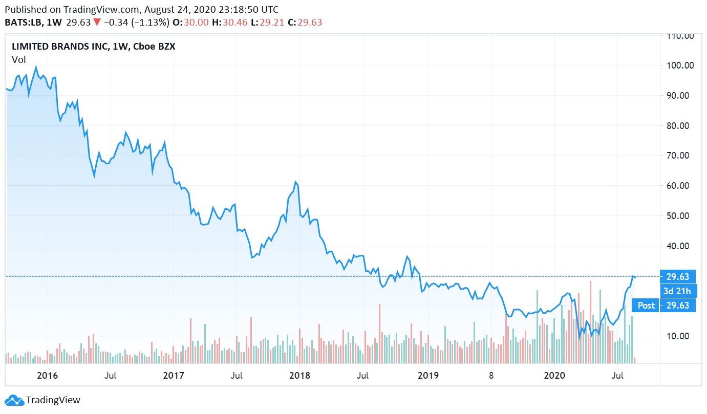 Image Shown: Though shares of L Brands Inc are up year-to-date, they remain down significantly over the past five years as of this writing (before taking dividend considerations into account).