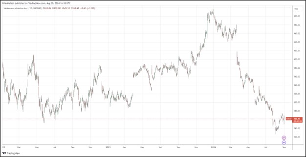 Looking to 2024, Lululemon now expects net revenue in the range of $10.375-$10.475 billion, representing growth of 8%-9%, below consensus numbers and lower than its initial guidance of $10.7-$10.8 billion. Diluted earnings per share is now expected to be in the range of $13.95-$14.15 for the year, down from previous guidance of $14.27-$14.47. We have no plans to add Lululemon to any newsletter portfolio.