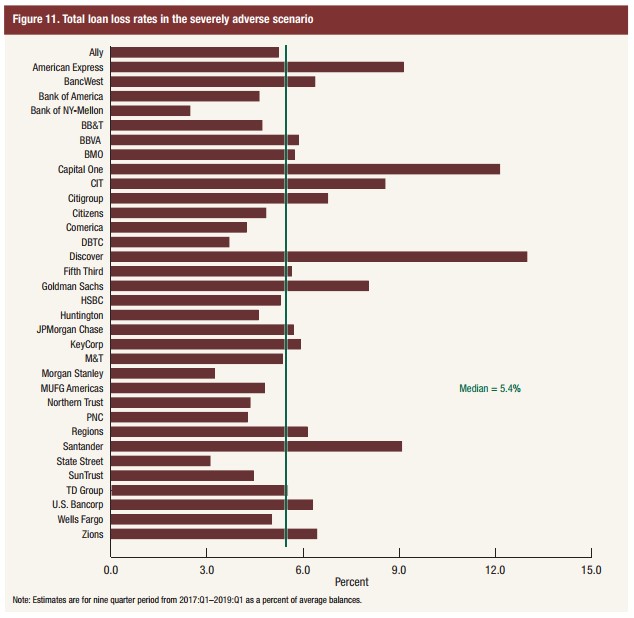 There are a variety of ways to gauge the financial risk of banking entities, however, and I find the ‘total loan loss rates in the severely adverse scenario’ to be an informative one, too. Interestingly, a couple of the same credit card companies–American Express, and Discover, as well as Capital One (COF)–and Santander (SAN) would be most exposed to heavy losses in this department. Under a crisis scenario, hardly anything happens as expected, so investors should take the results of such tests with a grain of salt.