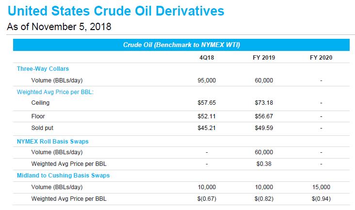 Marathon Oil has entered into Midland basis swaps that cover 10,000 bpd of its Permian oil output through the end of 2019. That ensures its differential will only be $0.67 a barrel below WTI in this quarter and $0.82 per barrel below WTI next year for its hedged Permian oil sales. During the third quarter of 2018, Marathon Oil pumped 12,000 barrels of crude per day net out of the Permian. Its Midland basis swaps will cover most of its expected Permian oil output this quarter and a large portion of its expected crude output next year.