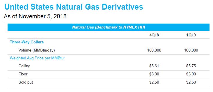 As of early-November, Marathon Oil hedged 95,000 bpd of its domestic fourth quarter oil production through three-way collars benchmarked to West Texas Intermediate. During the third quarter of 2018, Marathon Oil pumped out a net 168,000 bpd of crude oil from its US operations (adjusted for divestments). With roughly half of its expected US oil production hedged this quarter, Marathon Oil has some downside protection from the recent fall in WTI.