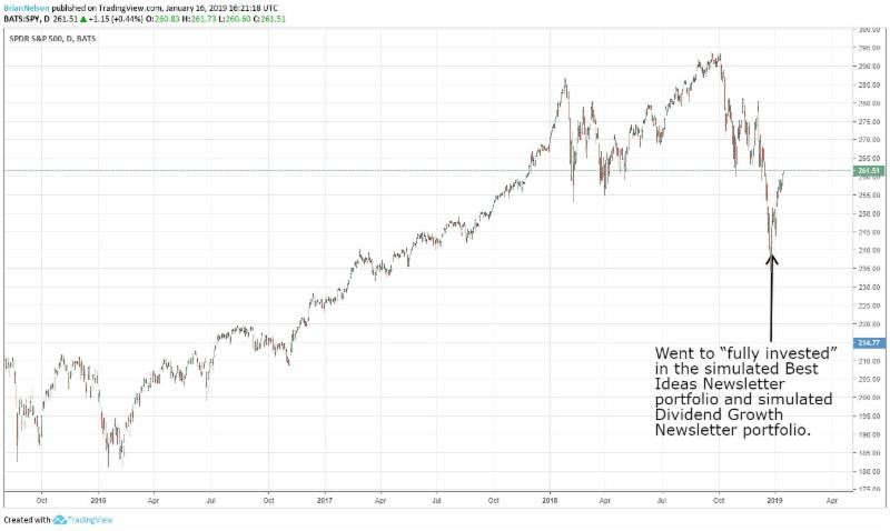 Image shown: This holiday season was mighty hectic, and not many were anticipating the volatility we experienced. Here’s where the simulated Best Ideas Newsletter and simulated Dividend Growth Newsletter portfolios went to “fully invested,” reducing a 30% and 20% cash “weighting” at the high end of their respective ranges for each portfolio, respectively. Email.