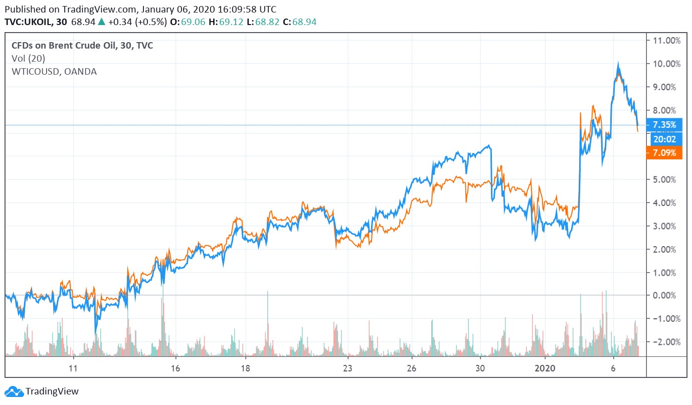 Oil and other commodity markets (such as gold and other “safe haven” assets, a term we find a tad silly given gold has limited intrinsic value beyond the ability to sell gold to another buyer, but we digress) experienced some powerful reactions to these events, with West Texas Intermediate (USO) and Brent (BNO) both shooting upwards initially on the news as shown in the graphic below.