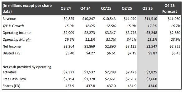 On October 21, Netflix (NFLX) reported mixed third quarter results with revenue coming in line with expectations, but GAAP earnings per share missing the consensus forecast. In the third quarter, revenue grew 17% due to membership growth, pricing adjustments and increased ad revenue, but its operating margin of 28.2% came in below guidance calling for 31.5% due to a $619 million expense related to an ongoing dispute with Brazilian tax authorities. Excluding this expense, Netflix would have exceeded its third-quarter operating margin forecast, and management noted that it doesn’t expect the matter to have a material impact on future results. Diluted earnings per share of $5.87 was better than the $5.40 mark it achieved in last year’s quarter. Cash flow from operating activities in the third quarter was $2.8 billion versus $2.3 billion in the prior-year period, while free cash flow totaled $2.7 billion, up from $2.2 billion in last year’s quarter.