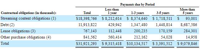 Though we love the operating leverage potential of Netflix’s business as it continues to achieve increasingly attractive economies of scale, the combination of significantly negative free cash flow generation combined with massive financial obligations–both in the form of traditional debt and off-balance sheet obligations such as streaming content obligations–are not an attractive feature of its business. As of the end of the third quarter of 2018, Netflix had $18.6 billion in streaming content obligations, up from $18.4 billion and $17.0 billion a quarter and a year earlier, respectively. Long-term debt on the balance sheet was just over $8.3 billion at the end of the third quarter of 2018, but the image below, taken from Netflix’s second quarter 2018 10-Q, shows the company’s contractual obligations for the years ahead.