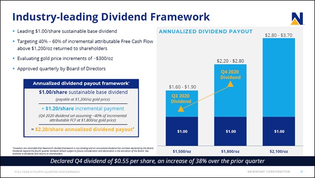 Image Shown: Newmont continues to aggressively increase its dividend, highlighting why we are big fans of the gold miner’s income growth upside. Image Source: Newmont – Fourth Quarter of 2020 IR Earnings Presentation
