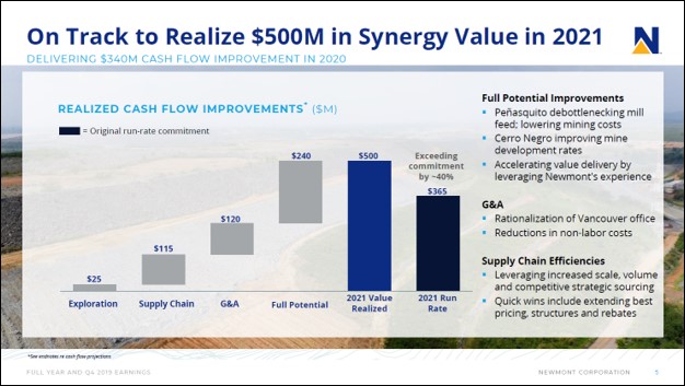 Image Shown: Newmont’s plan to generate synergies from its Goldcorp purchase is bearing more fruit than expected. Image Source: Newmont – Fourth Quarter and Full-Year 2019 IR Earnings Presentation