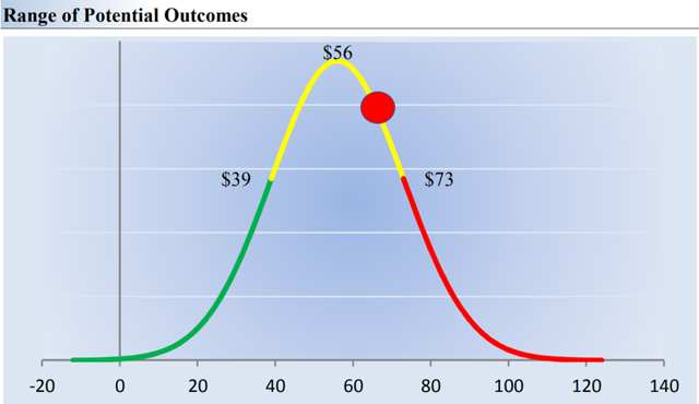 Image shown: The red dot denotes where shares of the company are trading. If it falls on the green part of the fair value estimate distribution, we think shares are undervalued. If it falls on the yellow part of the fair value estimate distribution, we think shares are fairly valued, and if it falls on the red part of the fair value estimate distribution, we think shares are overvalued (as of the time of this publishing).