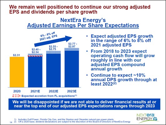 NextEra Energy’s long-term financial expectations remain unchanged. For 2021, NextEra Energy expects adjusted earnings per share to be in the range of $2.40 to $2.54. For 2022 and 2023, NextEra Energy expects to grow 6% to 8% off the expected 2021 adjusted earnings per share. For 2022 and 2023, this translates to an expected adjusted earnings per share range of $2.55 to $2.75 and $2.77 to $2.97, respectively.