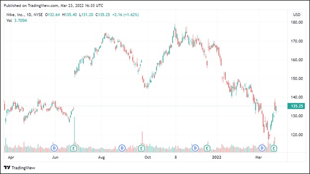 Image Shown: Shares of Nike Inc are on an upward climb again after dropping significantly from November 2021 to March 2022.