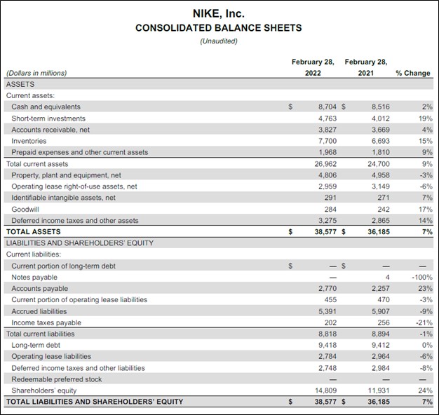At the end of February 2022, Nike had a net cash position of $4.0 billion with no short-term debt on the books. Its pristine balance sheet is an immense source of strength during these harrowing times. Please note that Nike also had $3.2 billion in short- and long-term operating lease liabilities combined on the books at the end of this period.
