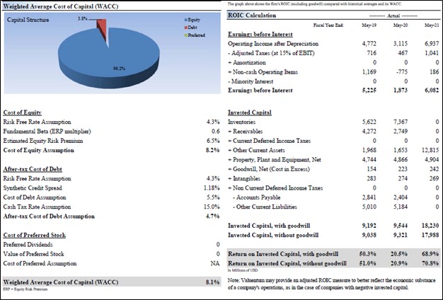 Image Shown: Nike is a tremendous generator of shareholder value (its historic ROIC ex-goodwill > estimated WACC) and we expect that will continue being the case going forward. Image Source: Valuentum, with data from Nike