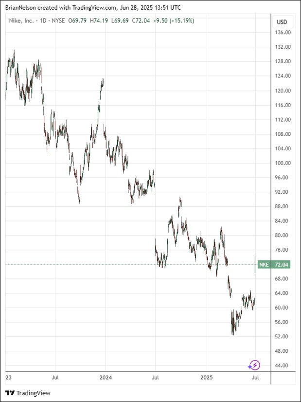 On June 26, Nike (NKE) reported better than expected fourth quarter fiscal 2025 results with revenue and GAAP earnings per share exceeding the consensus forecasts. Fiscal fourth quarter revenues were $11.1 billion, down 12% on a reported basis and 11% on a currency-neutral basis. Nike Direct revenues were down 14% on a reported and currency-neutral basis in the quarter, while wholesale revenues fell 9% on a reported and currency-neutral basis in the period. Quarterly revenues for Converse fell 26%. Gross margin declined 440 basis points in the fiscal fourth quarter, to 40.3%, while diluted earnings per share fell 86% in the quarter, to $0.14.