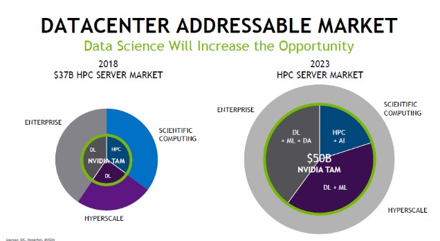 Mellanox Technologies provides end-to-end Ethernet and InfiniBand smart interconnect offerings for servers and storage operations, making this purchase a play on the datacenter space where Nvidia has grown its revenue from $0.3 billion in fiscal 2016 to $2.9 billion in fiscal 2019. However, this is also an area experiencing an investment slowdown and that’s largely why Nvidia had to scrap its full fiscal year guidance. We will be monitoring the datacenter market going forward. Merging these two companies together will create a leading player in the high-performance computing space. Nvidia notes that this market had a total addressable value of $37.0 billion in calendar year 2018. That is forecasted to grow to $50.0 billion by 2023 in the eyes of several analysts as you can see below.