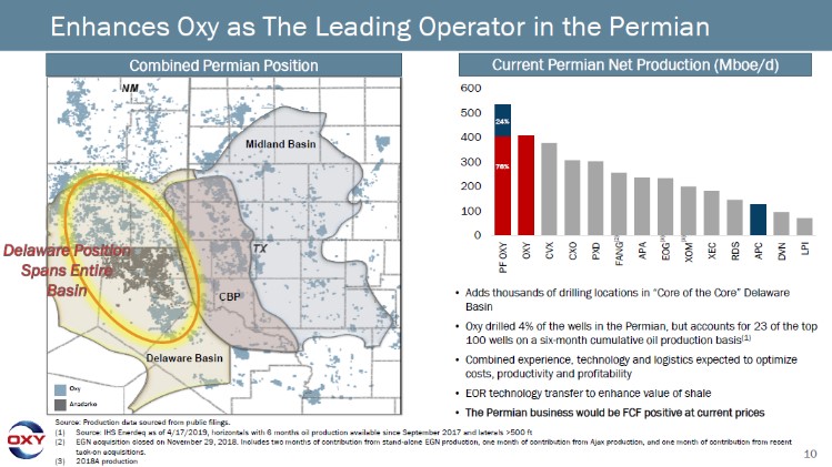 Occidental produced over 400,000 barrels of oil equivalent net from the Permian Basin during the final quarter of 2018, which includes output from its unconventional (fracking) division and production from its conventional enhanced oil recovery operations (managing output from mature fields and attempting to boost recovery rates through new technologies and development methods). Adding Anadarko’s output to that would further entrench Occidental as the leading upstream player in the Permian with the largest production base in the region. During the conference call discussing Occidental’s thoughts on the acquisition, the firm’s CFO Cedric Burgher noted that;