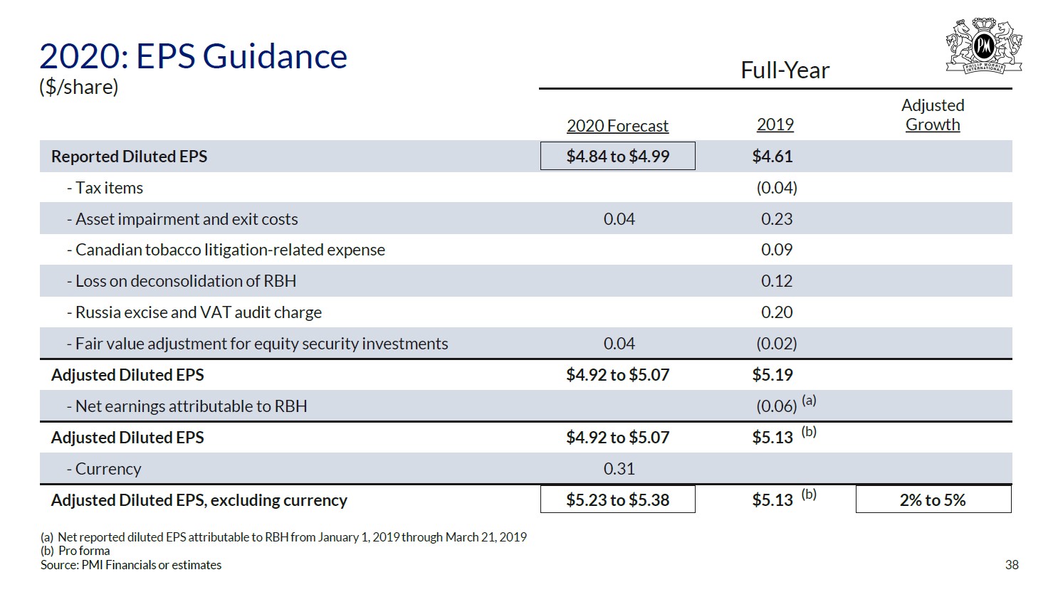Even with these headwinds in mind, Philip Morris International still expects to grow its non-GAAP adjusted diluted EPS this year versus 2019 levels when excluding foreign currency headwinds. Please note that foreign currency headwinds are expected to be very material this year, which is why we always take adjusted guidance with a grain of salt. Excluding foreign currency headwinds and other factors, Philip Morris International expects to grow its non-GAAP diluted EPS by 2%-5% this year as you can see in the upcoming graphic down below. This growth is expected to be made possible by a sharp rebound in its financial performance by the fourth quarter of 2020.