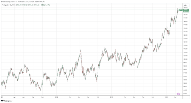 Image: Phillips 66’s shares continue to hover near all-time highs thanks to a favorable energy resource environment.