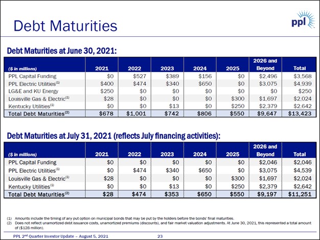 Recently, PPL Corp paid down $3.5 billion of its debt through various tender offerings that were concluded in July 2021 (some of these activities were completed in the second quarter and some in the third quarter of this year). We are pleased to see PPL Corp putting its net cash infusion to good use. In the upcoming graphic down below, PPL Corp highlights the well-staggered nature of its debt maturity schedule.