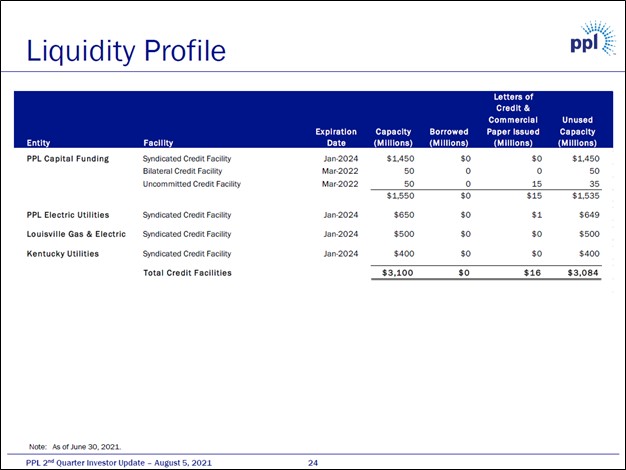 Image Shown: PPL Corp has ample access to liquidity via its numerous revolving credit lines. Image Source: PPL Corp – Second Quarter of 2021 IR Earnings Presentation