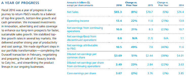 Procter & Gamble (PG) has been working through a massive portfolio transformation during the past several years, but with the last major step in the transformation taking place earlier this October, “Analyzing Procter & Gamble’s Exchange Offer,” the firm is preparing to retrain its focus on 10 categories where it holds leading market positions. We continue to hold shares of Procter & Gamble in the Dividend Growth Newsletter portfolio, even as we note the company is not what it once was after several years of revenue declines. Reported sales fell 5% in fiscal 2015 and another 8% in fiscal 2016, while both operating income and net earnings from continuing operations remain below fiscal 2014 levels.